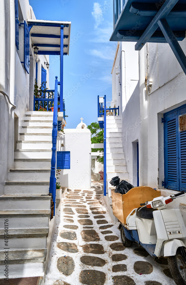Beautiful traditional narrow streets, cobbled alleyways of Greek island town. Whitewashed houses, blue balconies, parked old scooter. Mykonos, Greece.
