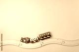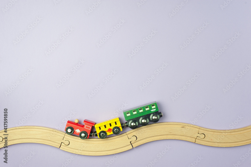 Toy railway and a small train on a purple background. Flat lay, Top view. Place for text