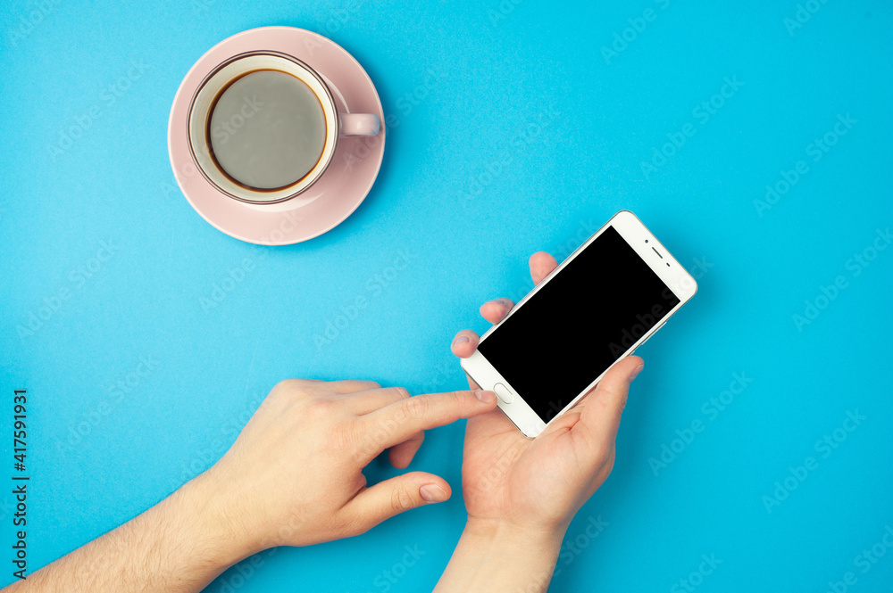 Mockup - man's hand holds a smartphone on a blue background and a cup of coffee. Place for text