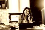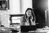 Young smiling business woman working from home sitting in front of laptop computer at home kitchen. Using smart phone