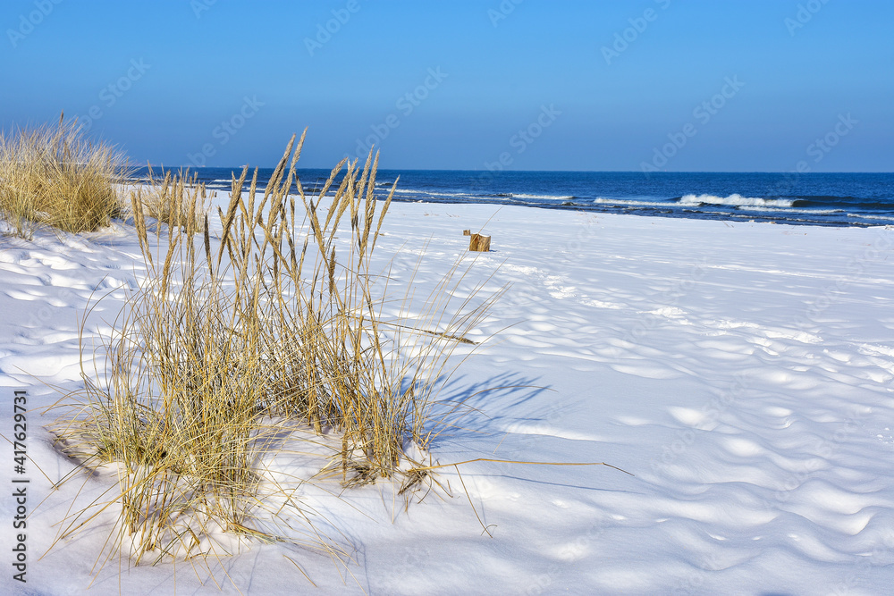 Snow on the beach and the Baltic Sea. Beautiful winter landscape