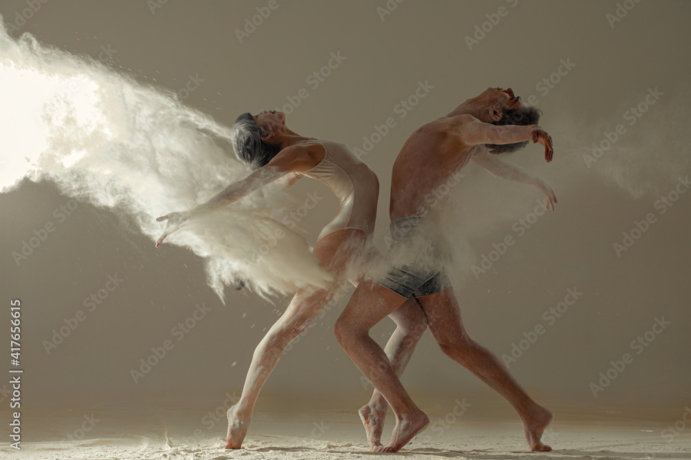 Two ballet dancers perform dance against background of white flour cloud in air.