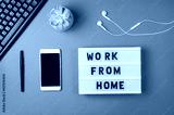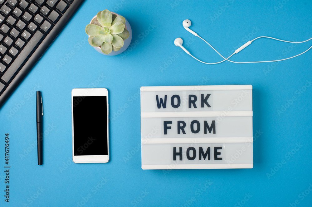 Work from home - text on display lightbox and smartphone mockup on blue background workplace. Black keyboard and white earphones. Freelance work concept