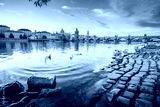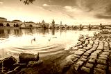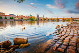 Breathtaking view on Charles bridge and white swans at Vltava river in Prague, Czech Republic.