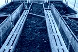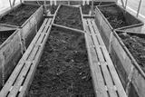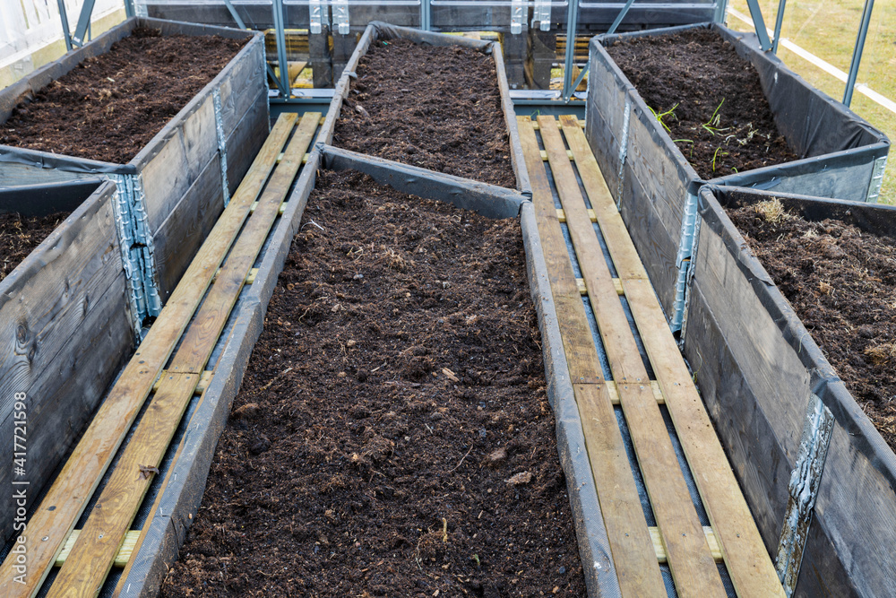 View of prepared garden beds in a greenhouse for planting vegetables in early spring. Home gardening concept. Sweden.