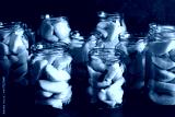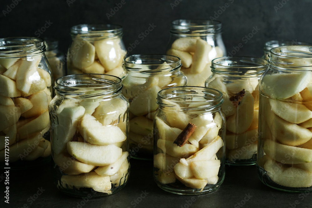 Closeup shot of glass transparent bottle jars filled with ripe peeled pear slices