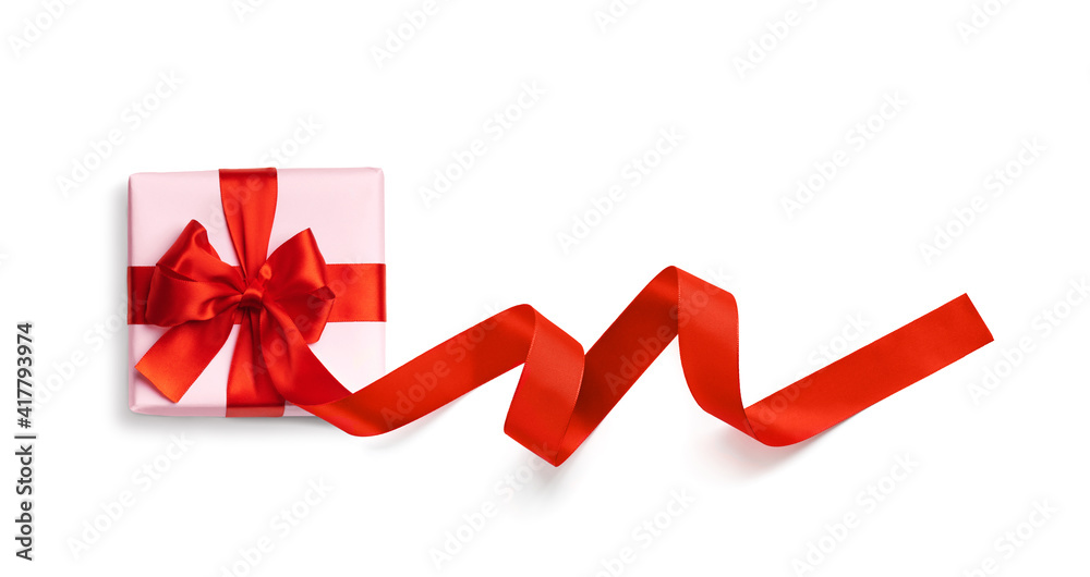 Pink gift box with red ribbon isolated on white background. Top view. Flat lay.