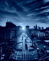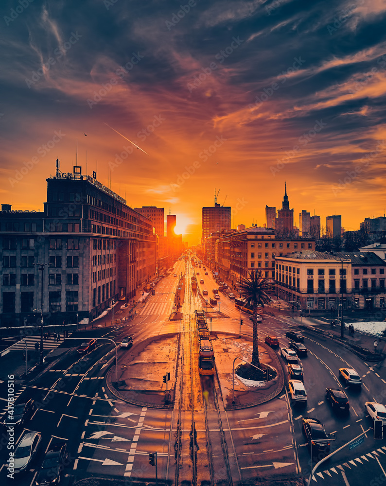 Beautiful panoramic aerial sunset drone skyline view of the Warsaw City Centre with skyscrapers of the Warsaw City Centre and artificial palm, Poland, EU