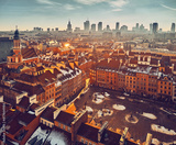 Beautiful panoramic aerial drone skyline sunset view of the Warsaw City Centre with skyscrapers of the Warsaw City and Warsaw's old town with a market square and a mermaid statue, Poland, EU