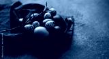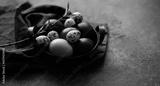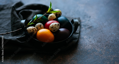 Vintage iron tray full of colorful Easter eggs with hay and spring branch on a dark rustic background. Copy space.