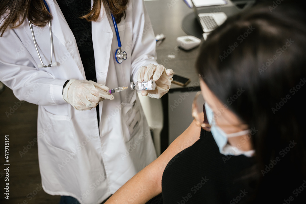 Nurse draws liquid from vial for injection with syringe - Doctor in hospital prepares vaccine against Coronavirus Covid-19 for patient with copy space - Medical practitioner vaccinates young woman