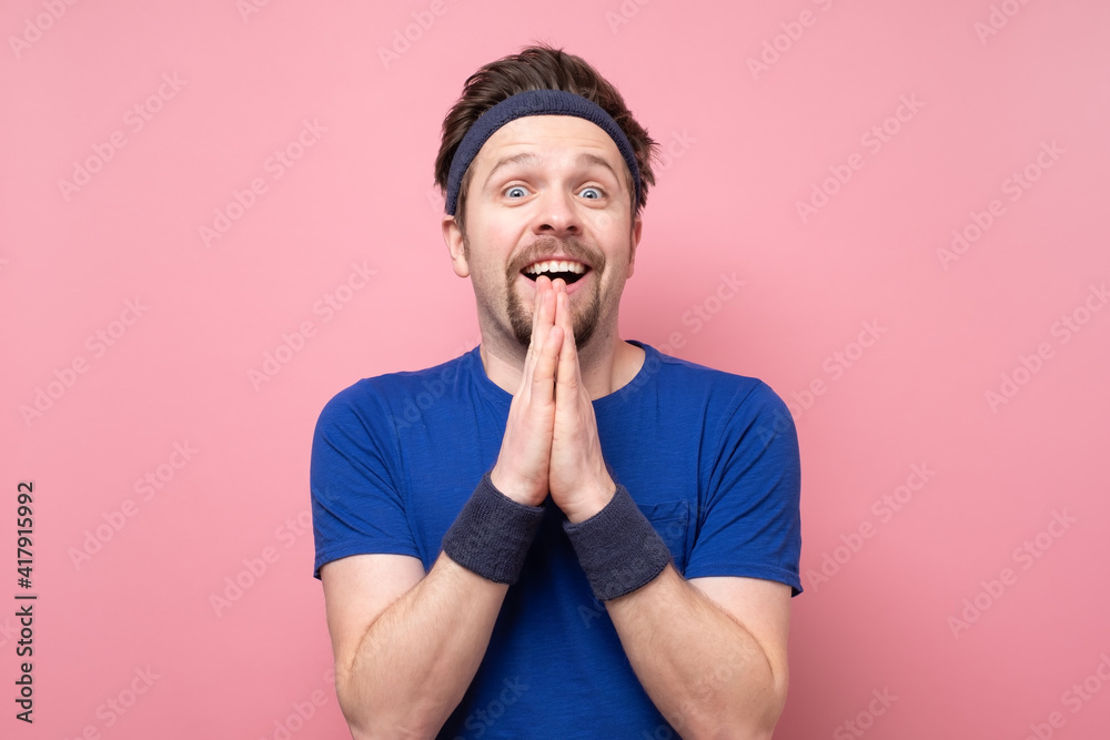 Surprised caucasian man dressed in sportswear gestures with surpise and hope