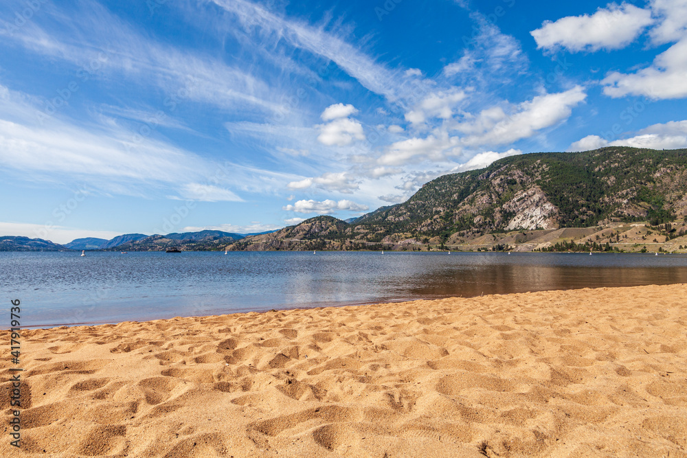 view o from the yellow sand beach to calm lake with mountains and cloudy sky