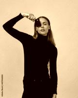 Pretty young woman wearing black clothes looking at camera, holding plastic credit card over her eye while posing isolated over gray background