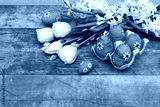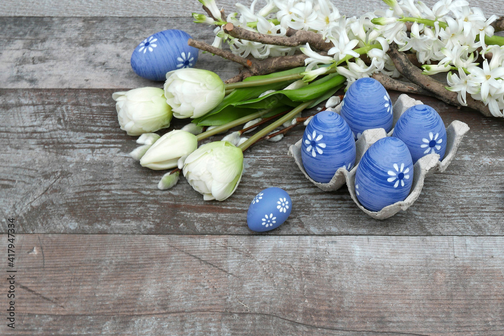 Blaue Ostereier mit Hyazinthen und Tulpen