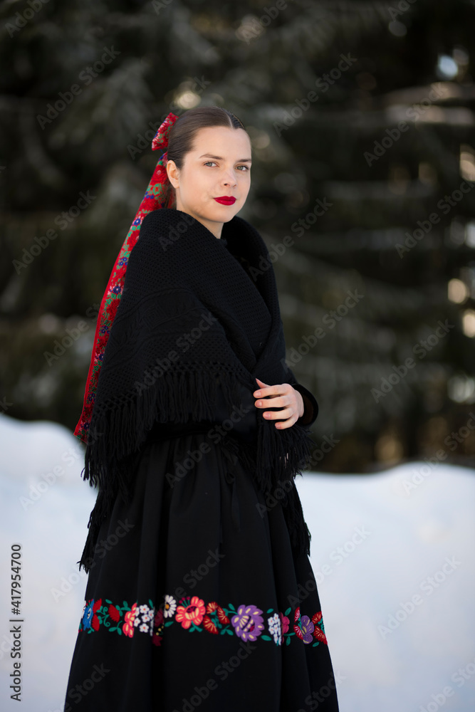 Young beautiful slovak woman in traditional dress. Slovak folklore