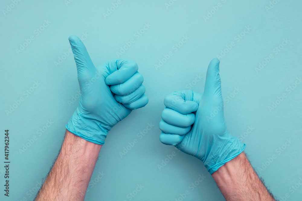 Doctors hand wearing protective surgical gloves giving thumbs up sign.