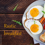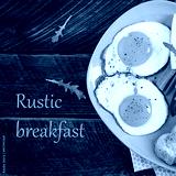 Breakfast. Fried eggs with fresh carrot, cucumber, paprika and toast on wooden background. Vegetarian meal. Top view, copy space