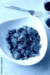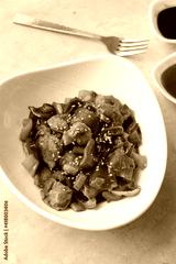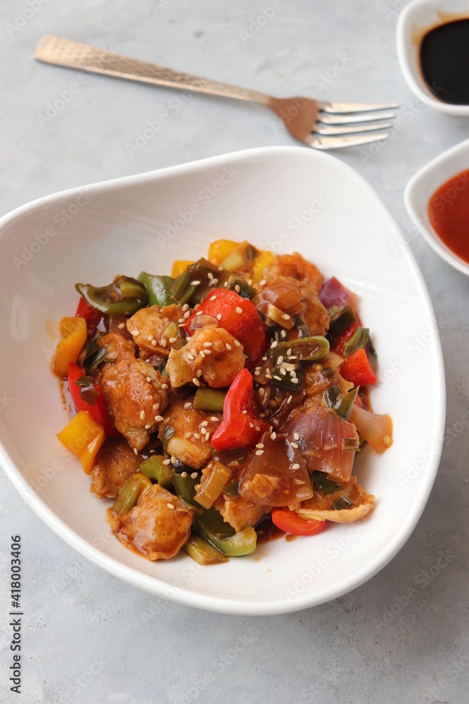 Indo-Chinese dish Prawns Chilli dry and fried rice. It is a non-vegetarian seafood dish popular in India. Fried shrimp with Indian and Chinese spices. Served with veg fry rice. Copy space.