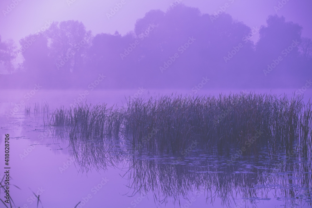 Magic sunrise over the lake. Misty early morning. Rural landscape. Mystical feeling. Serenity lake in magical light