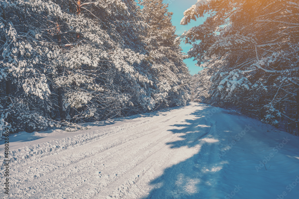 Road in the winter pine forest on a sunny day. Trees covered with snow