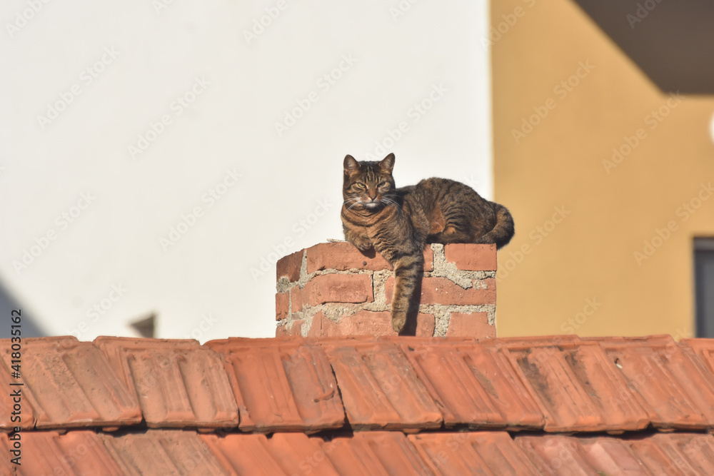 Domestic cat rest on the chimney on roof. Grey cat on the roof of house