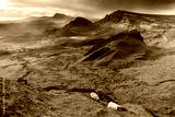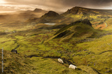 Scenic view of Quiraing mountains in Isle of Skye, Scottish highlands, United Kingdom. Sunrise time with colourful an rayini clouds in background.
