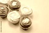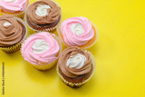 Chocolate and vanilla cupcakes with whipped raspberry and coffee cream on a yellow background. Selective focus.