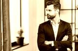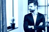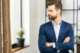 Portrait of a successful businessman with neat bristles, standing arms crossed, looking to the side, dressed in an expensive blue suit, elegant male model look in distance, side profile image