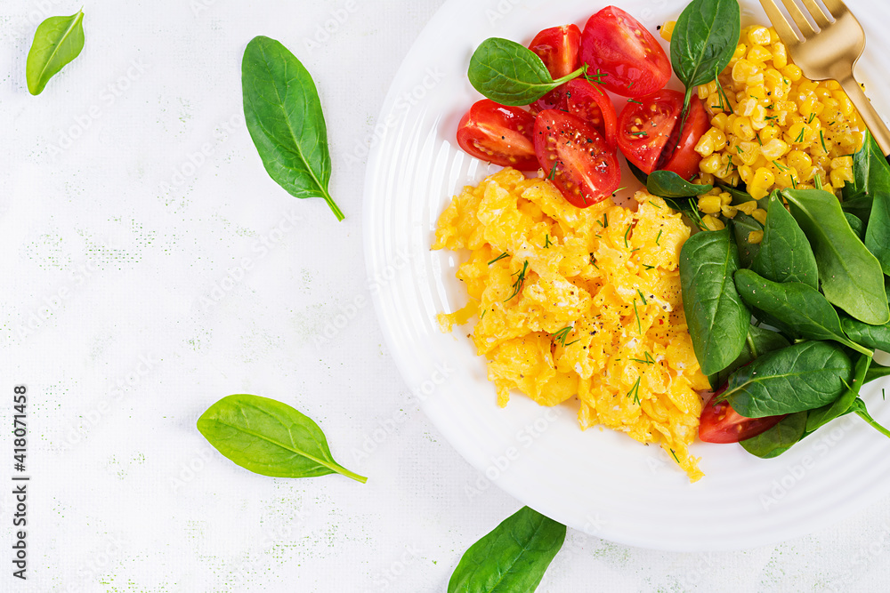Breakfast. Scrambled eggs with cherry tomatoes, spinach and corn. Top view, flat lay, above