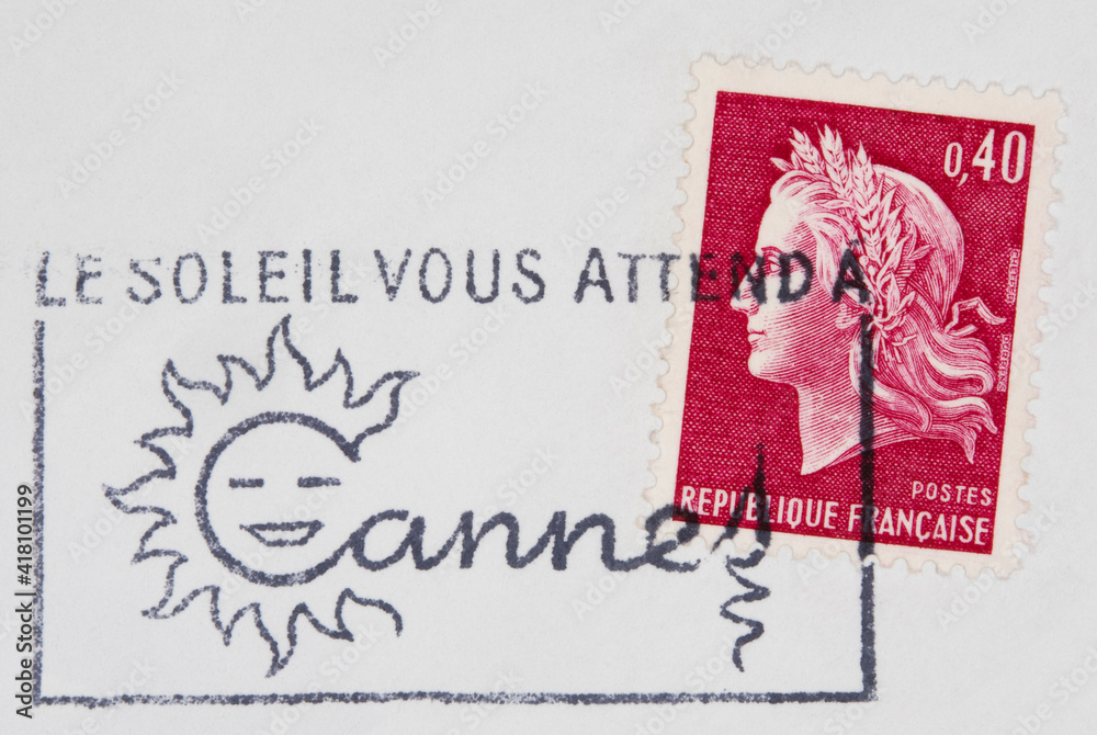briefmarke stamp gestempelt used frankiert cancel vintage retro post letter mail brief frankreich france french sonne sunshine sun slogan werbung le soleil vous attend a cannes rot red frau woman kopf