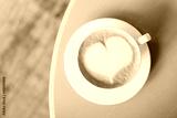 Top view of cup of cappuccino coffee with latte art on gray table in cafe.