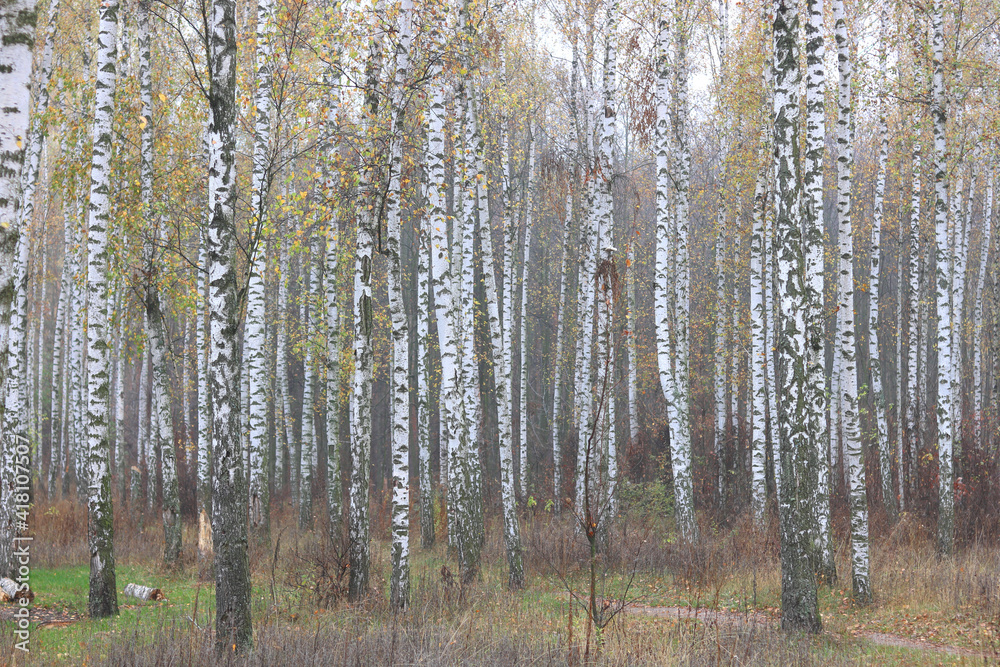 Young birches with black and white birch bark in spring in birch grove against background of other birches