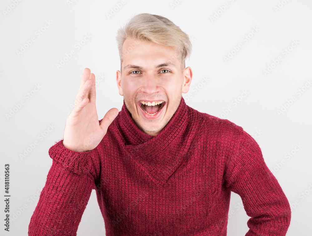 man in a red sweater with a beard laughs holding his stomach, logo, joy, laugh