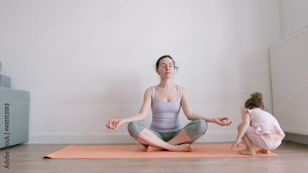 Mother sits in lotus position on yoga mat and little girl plays near