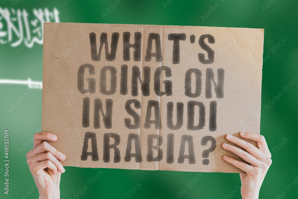 The question " What's going on in Saudi Arabia? " on a banner in men's hand with blurred Saudi Arabian flag on the background. Protests on the street. Riot. Violence. Crisis. Collapse. Politics