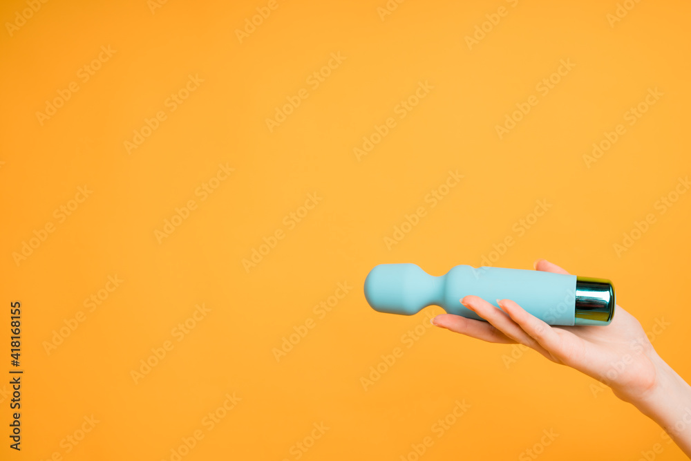 Blue vibrator or masturbation massager on an orange background. Flat Lay. Sex shop concept