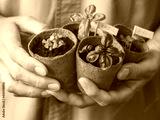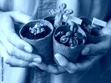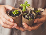 Woman holds basil seedlings in peat pots. Spring sale in mall and flower shops. Season of growing seedlings and planting plants in ground. Botanical hobby.