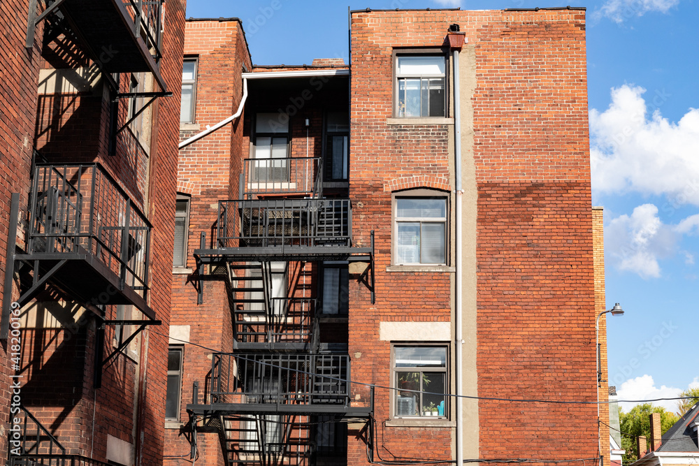 Rear view of an old apartment building with black steel fire escapes and balconies, horizontal aspect