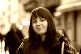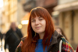 An attractive young woman with dyed red hair and a little overweight against the background of the city, a close-up street portrait. The cheerful face of a fat girl in daylight.