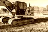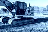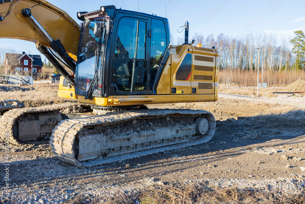 Close up view of construction excavator on outdoor construction place on spring blue sky background. Sweden.
