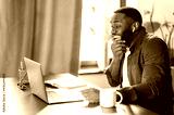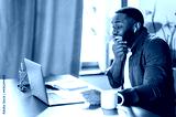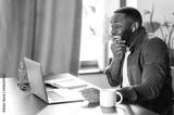 Joyful African American guy dressed in stylish clothes uses a laptop for online work, sitting at his desk, happily looks at the screen, got a good message