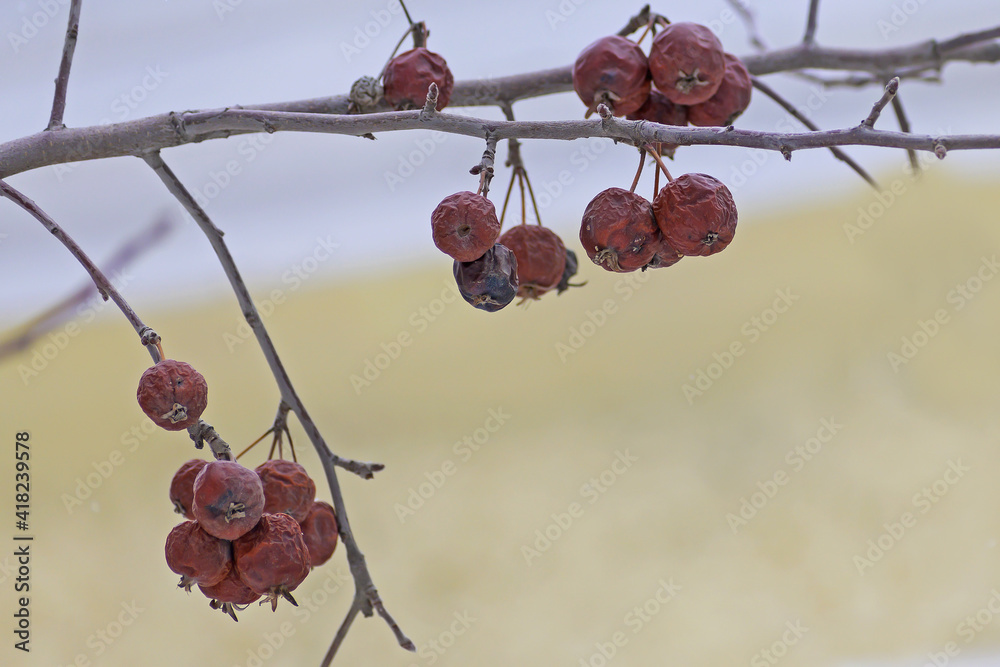 Wild apple tree branches with frozen fruits close-up