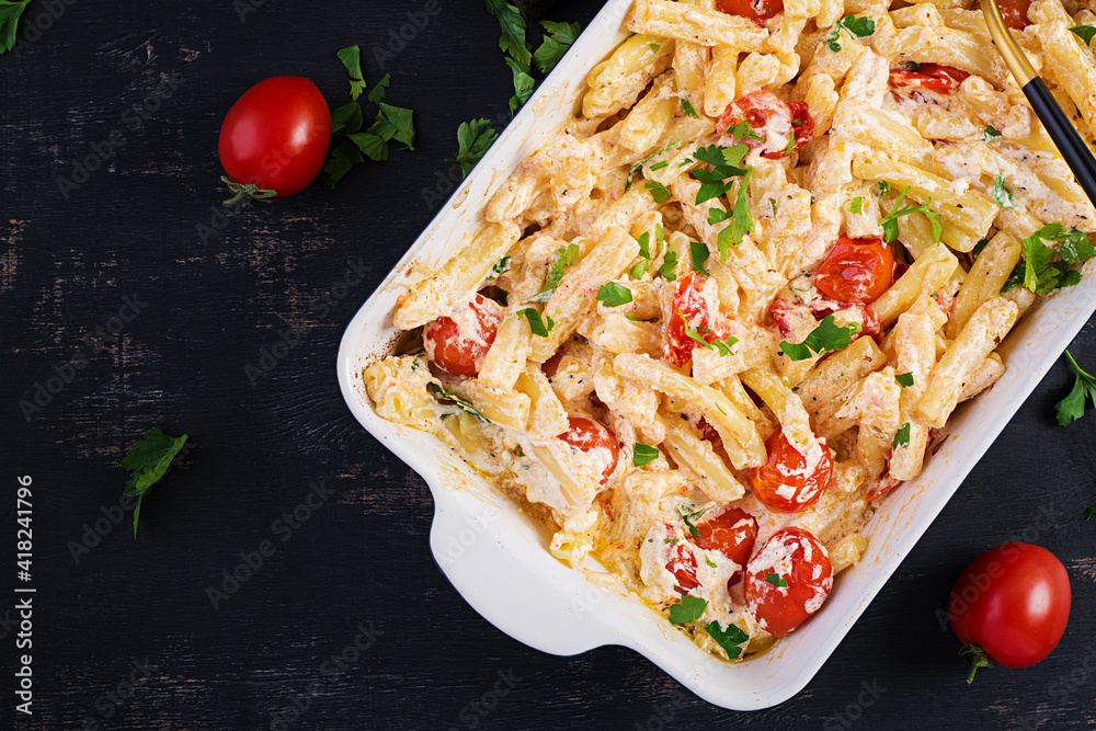 Fetapasta. Trending viral Feta bake pasta recipe made of cherry tomatoes, feta cheese, garlic and herbs in a casserole dish. Top view, above, copy space.