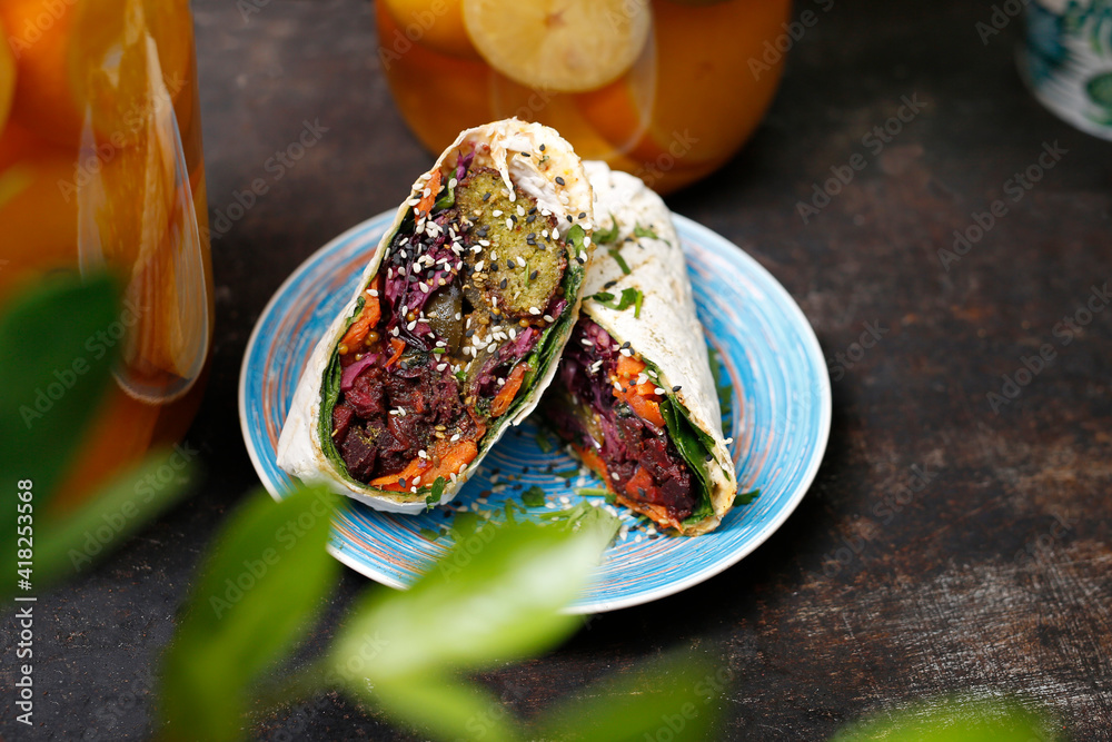Vegetarian kebab, falafel with vegetables in pita bread.