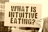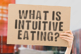 The question " What is intuitive eating? " on a banner in hand with blurred background. Food. Meal. Nutrition. Healthcare. Nutrient. Brain. Mind. Freedom. Free. Choice