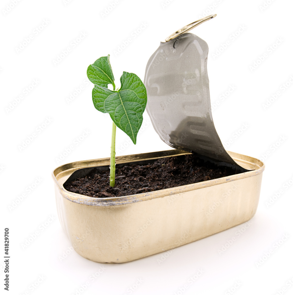 Distorted image of a fresh plant growing in garbage can