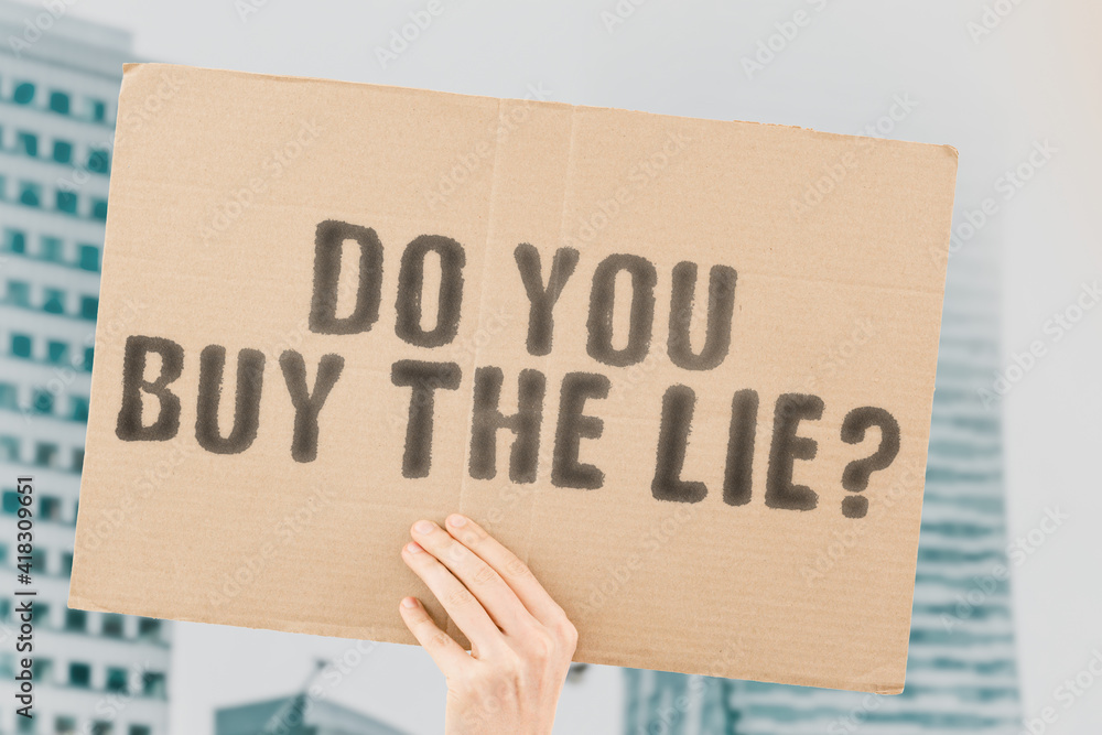 The question " Do you buy the lie? " on a banner in hand with blurred background. False. Liar. Lies. Statement. Fraud. Service. Commerce. Selling. Internet. Money. Loss