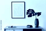 Stylish interior of living room with mock up poster frame, wooden commode, book, tropical leaf in ceramic vase and elegant personal accessories. Minimalist concept of home decor. Template.