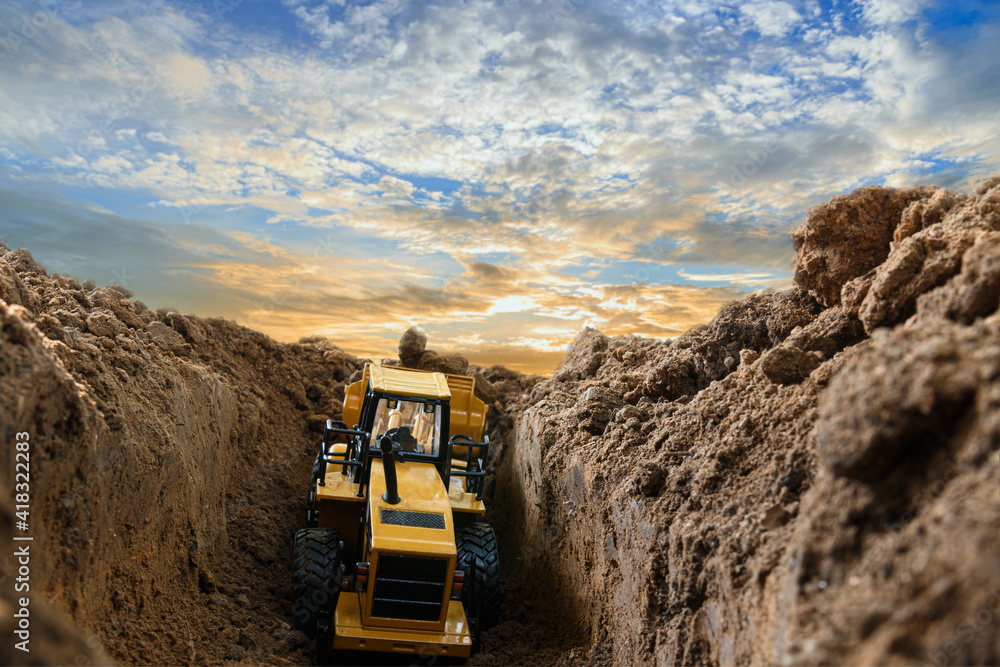 Wheel loader are digging the soil in the construction site on the blue sky background and sunset